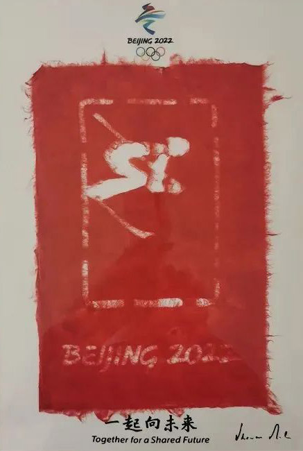 下圖便是使用徽州楮皮紙制作的北京冬奧會紙藝作品紀(jì)念品。一張厚實的白色襯紙上張貼著特別裁剪過的紅色襯紙,映出栩栩如生的高山滑雪樣式和“BEIJING 2022”字樣,十分高雅。